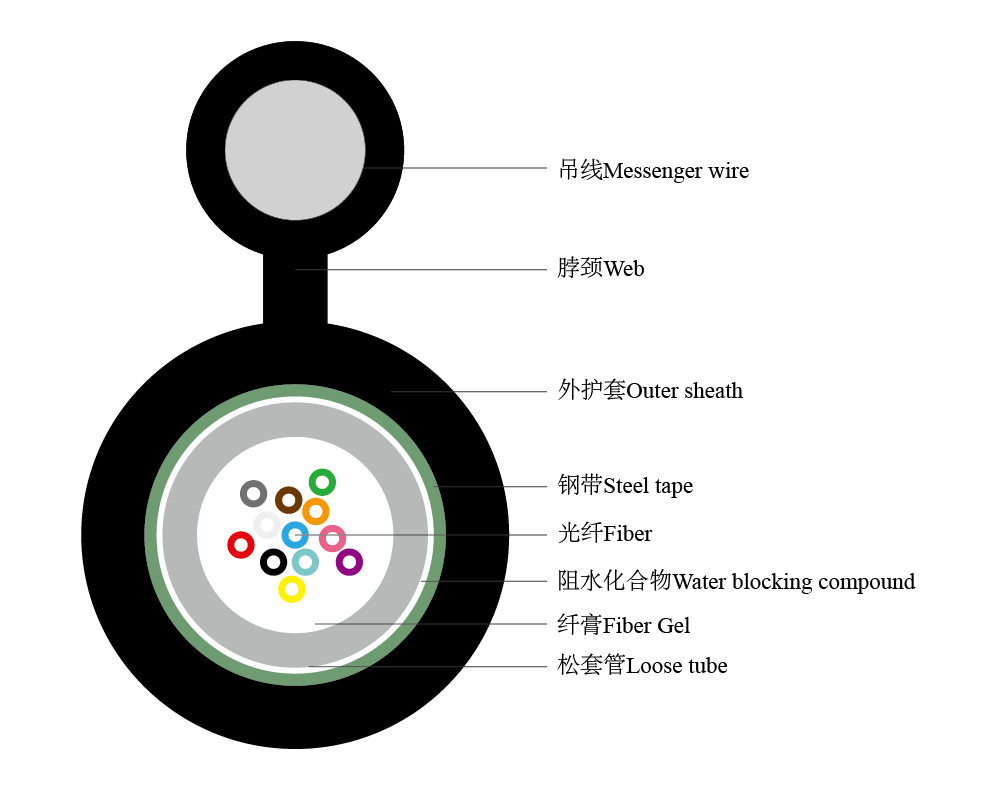 ساختار آن ترکیبی از یک لوله مرکزی شل پر از ژلطراحی خودنگهدار شکل-8زره نوار فولادی موجدار و یک سیم مسیریاب جداگانه—یا یک رشته فولادی گالوانیزه یا یک سیم فولادی منفرد—تشکیل میدهد که یک پروفیل 8 شکل قوی و قابل اعتماد را ایجاد میکند که برای دهانههای قطب به قطب ایدهآل است.